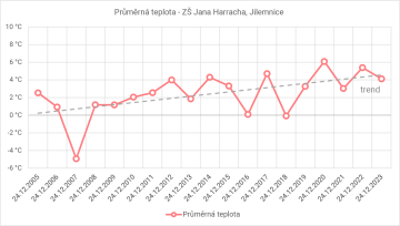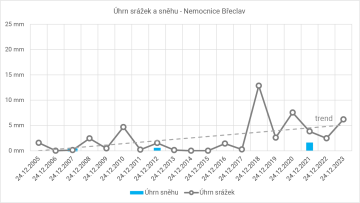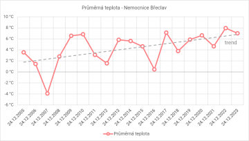 - Průměrná denní teplota se na Štědrý den pohybuje v rozmezí od -3,9°C (rok 2007) do 7,9°C (rok 2022), přičemž je patrný trend oteplování.
