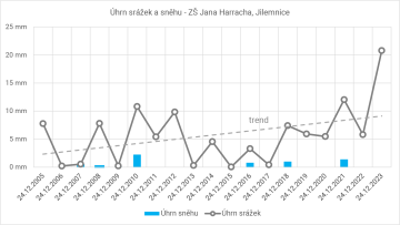 - Srážky jsou od roku 2017 na Štědrý den běžným jevem s nejvyšším úhrnem 12,9 mm, avšak kombinace srážek a teplot pod 0 °C, která umožňuje sněžení, je spíše výjimečná. Nejvhodnější podmínky pro sněžení nastaly v roce 2021, kdy napadlo 1,6 mm sněhu.