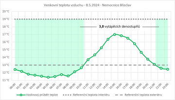 Kolik vytápěcích denostupňů evidujeme pro adresu Nemocnice Břeclav dne 8.5.2024 pokud při stejných referenčních teplotách sečteme denostupně pro každou hodinu: