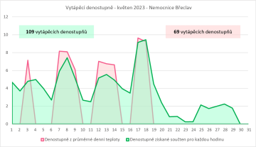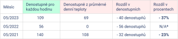 * N/A – procentuální rozdíl nelze vypočítat kvůli dělení nulou (pokud by byl v květnu 2022 z průměrné denní teploty vypočten jeden vytápěcí denostupeň, procentuální rozdíl by byl - 98%).